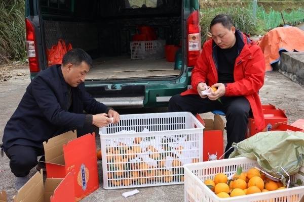 采摘后的鲜果被快速运至打包区。这里实行标准化流水作业:分拣、品控、称重、封装环节紧密衔接。品控员高笛正仔细筛查果品,确保外观、规格达标。工人们随后为橙子套上泡沫网套,分层装入垫有隔板的纸箱,封装贴单后整齐码放,等待装车。当天上午采收的橙子,将通过邮政网络在24小时内发往全国。